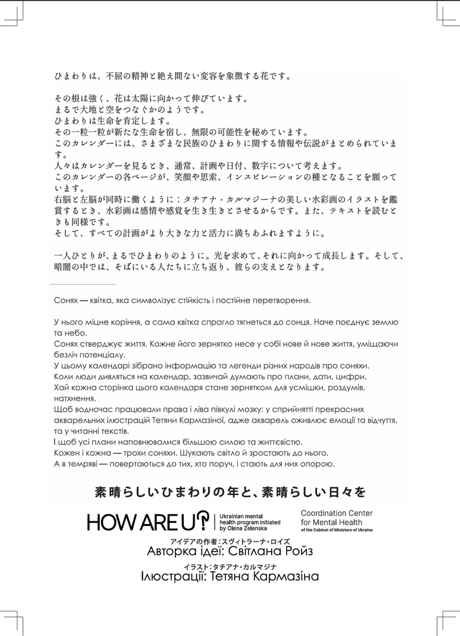 【オレナ・ゼレンスカ大統領夫人イニシアティブウクライナの全国国民的メンタルヘルスプログラ HOW ARE U?が贈る、やさしいひまわり画とメッセージ】